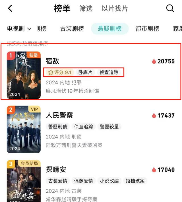 就在11月7日的时分,央八又给大伙儿安利了一部悬疑类型的国安反特剧《夙敌》,该剧依然上映,口碑就井喷了,在网罗播放平台内拿下来9.1的高分不说,还冲上了悬疑剧榜单的第又名。