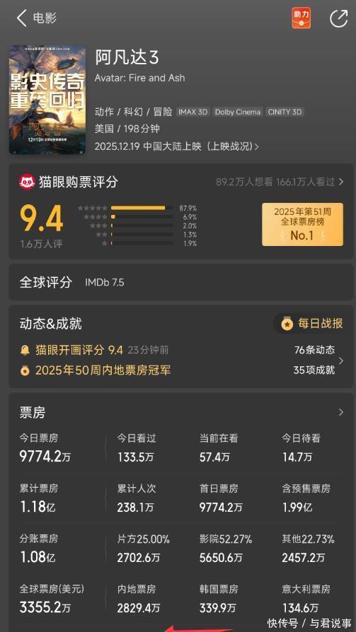 到2022年的第二部,这时世界电影如故大变样,但它仍然是王者归来,在统统这个词市集皆一派哀嚎的配景下,也能拿到17亿东说念主民币票房。 可到了第三部就完毕。 扬弃到发稿前,《阿凡达:火与烬》首映日内地票房天然破亿,但岂论是话题照旧票房后劲皆大不如前。
