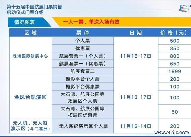 门票均选定名额销售的状貌进行售票。三地名额别离为:珠海国际航展中心每天限量8万张(11月15日—17日)、金凤台不雅演区每天限量2万张(11月13日—17日)、中国航展无东说念主机无东说念主船演示区(斗门莲洲)每天限量1.5万张(11月12日—14日)。