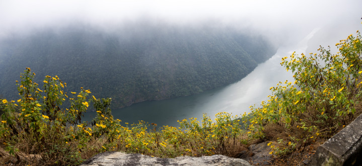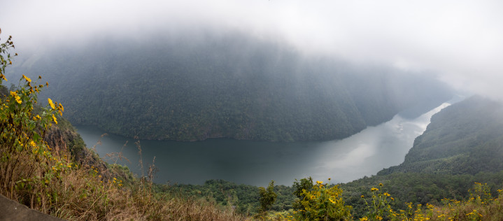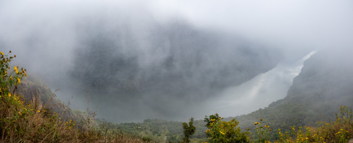 临沧市内似乎没什么出名的景点,咱们就沿214国说念去望望澜沧江大峡谷。上昼10点多到达不雅景平台,平台不大,要不是有商家在此摆摊,可能不留意就错过了。咱们仓猝停驻车,赶快爬上石台伸头去看,雾蒙蒙的,看得不算融会。