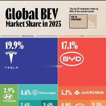 【小米汽车的出现,加快了新势力车企的停业潮!】图2:2023年民众电动汽车市集份额前十,特斯拉以19.9份额成为第一,比亚迪17.1%紧随自后。前十之后的其他品牌经营共34.9%。