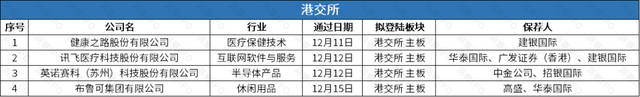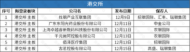 12月9日-12月15日,港交通盘6家公司递交上市肯求。