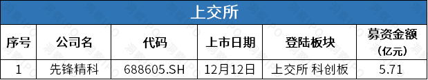12月9日-12月15日,上交所科创板有1家公司上市;深交所创业板有1家公司上市。