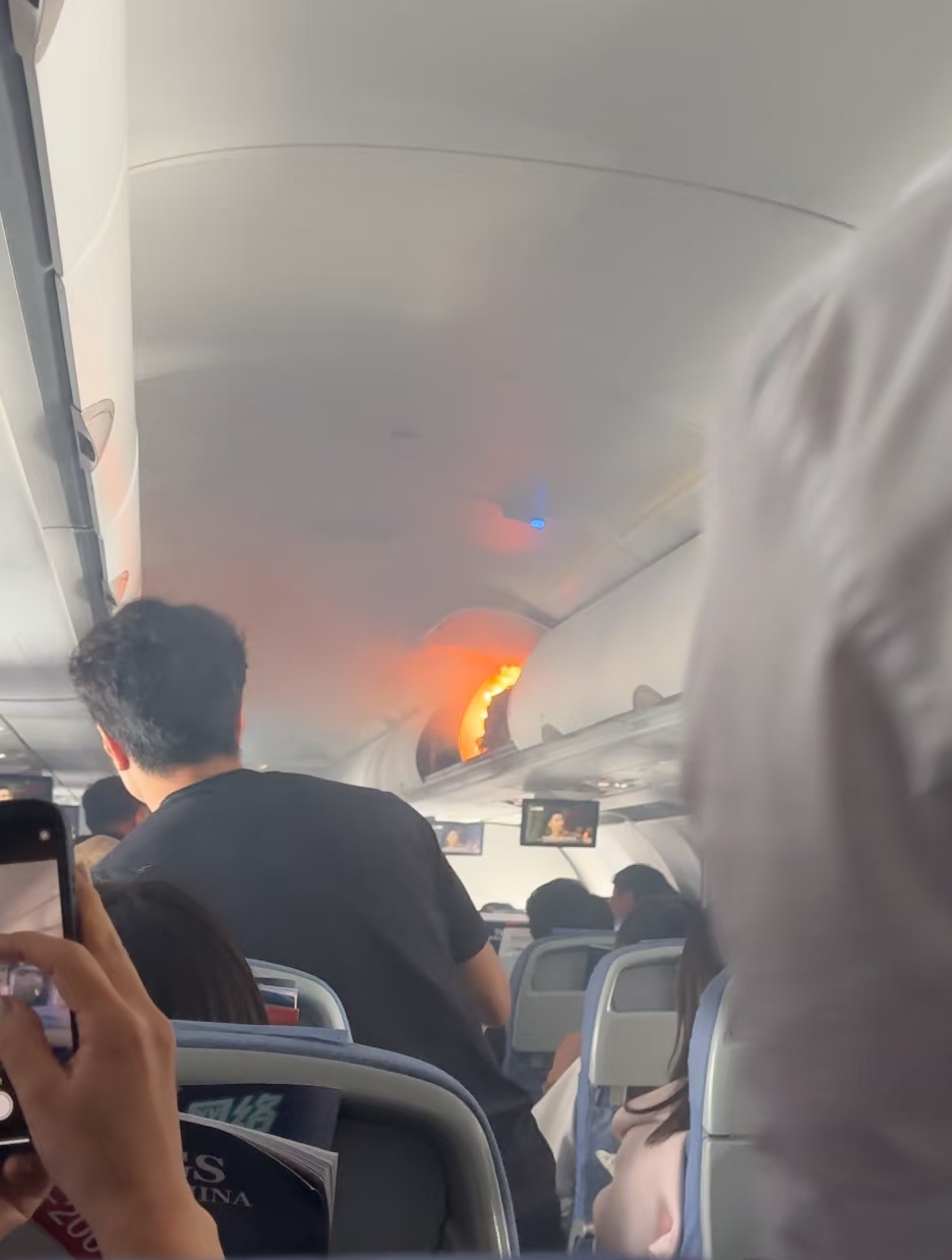 现场视频暴露,飞机客舱行李架上出现了明火,多名乘客发出惊呼,随后职责主说念主员伏击惩处。据飞机上乘客称,遨游一个多小时后,机舱行李架发火,“砰一声火径直喷出来了。”