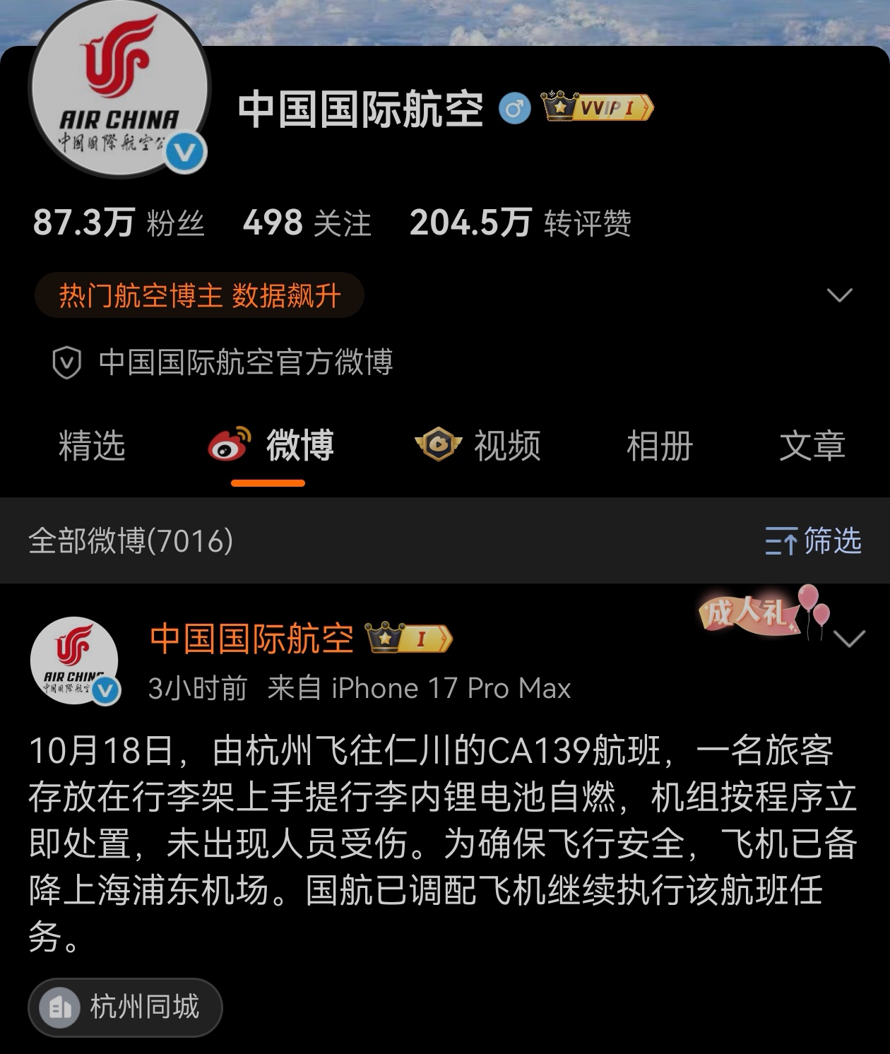 据中国海外航空官方微博,10月18日,由杭州飞往仁川的CA139航班,别称搭客存放在行李架上手提行李内锂电板自燃,机组按循序立即惩处,未出现东说念主员受伤。为确保遨游安全,飞机已备降上海浦东机场。国航已调配飞机不息推论该航班任务。