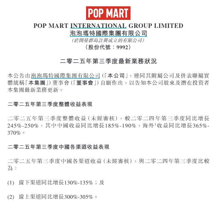 2025年第三季度,泡泡玛特举座收益(未经审核)较2024年第三季度同比增长245%~250%,其中中国收益同比增长185%-190%,国外收益同比增长365%~370%。