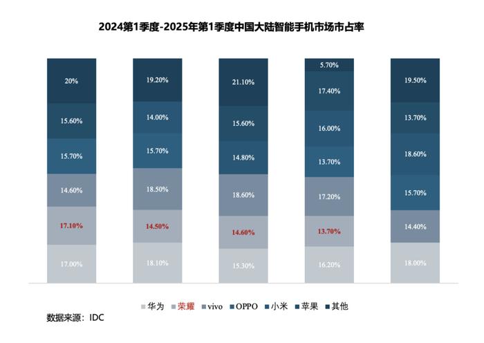 2024年四季度,荣耀在中国手机市集的市集份额仍是下滑至13.7%,同比下降14.9%。进入2025年一季度,荣耀市集份额陆续萎缩,跌出了前五名,这意味着荣耀的市集份额比第五名的13.7%还要低。