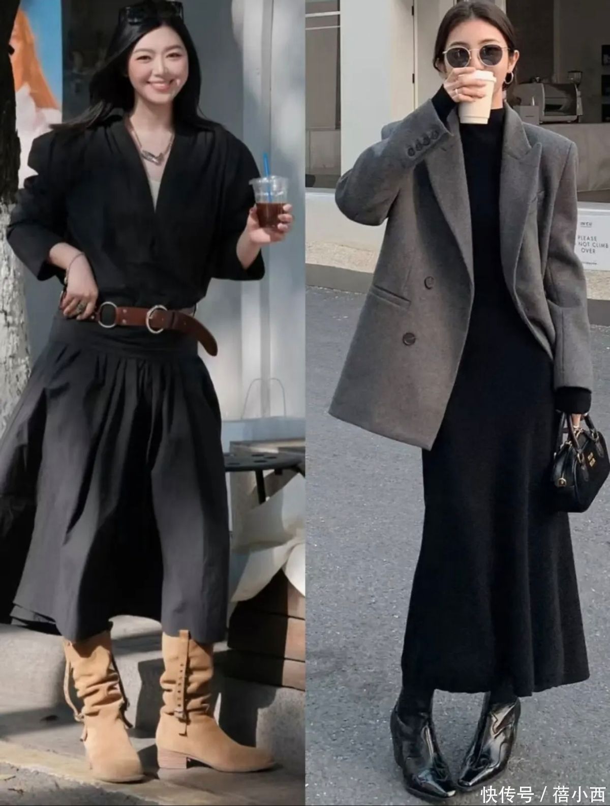 同色系搭配老是不会出错的选拔,比如玄色廓形外衣搭配玄色半身裙和短靴,能让你的搭配高档感翻倍,还零散显白。
