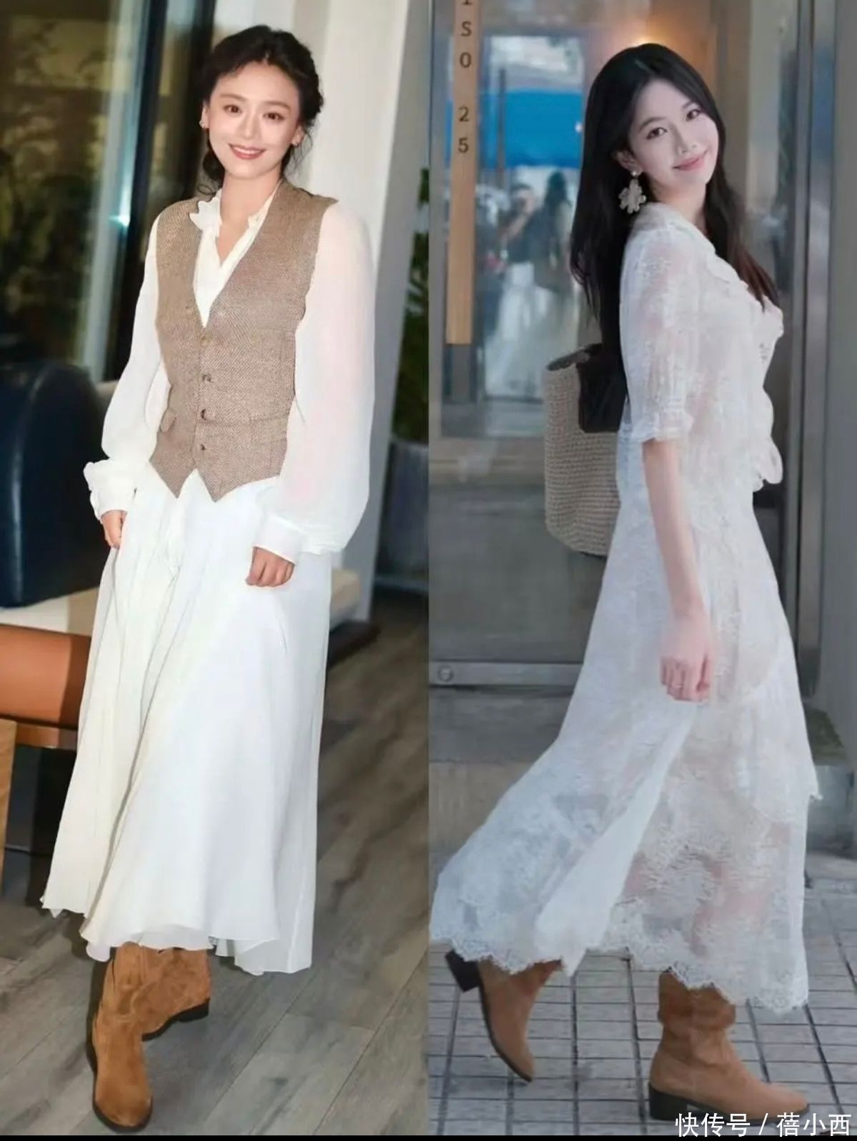 短马甲叠穿薄纱连衣裙,再搭配一对棕色中筒靴,这套是闭眼不出错的温存风搭配,零散适当30+女性。